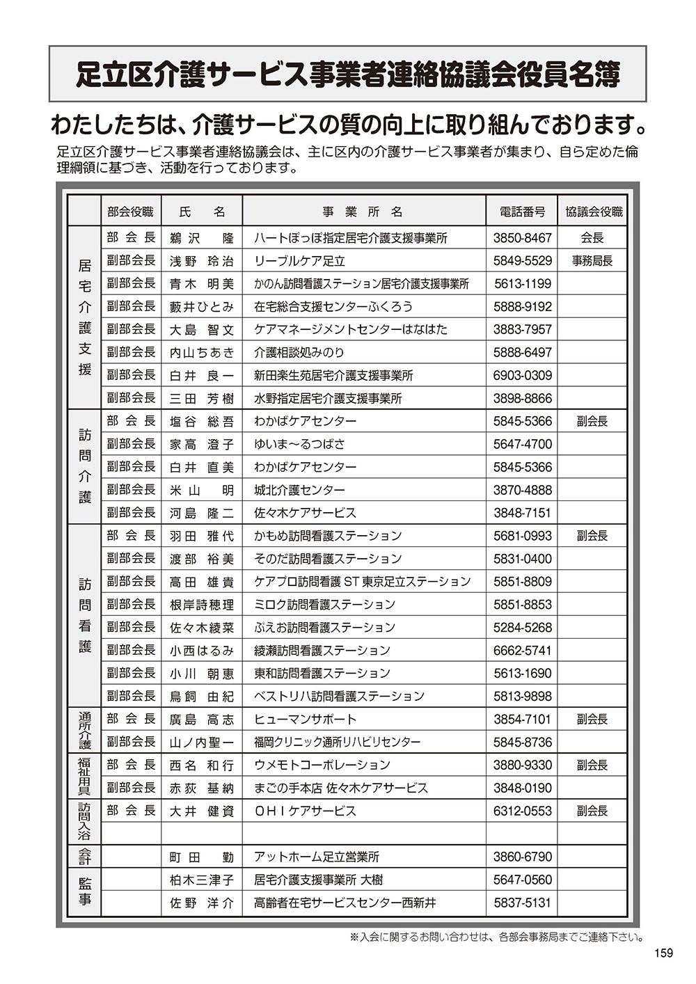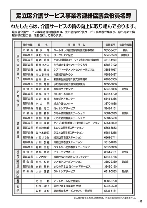 足立区介護サービス事業者連絡協議会は、主に区内の介護サービス事業者が集まり、自ら定めた倫理綱領に基づき、活動を行っております。